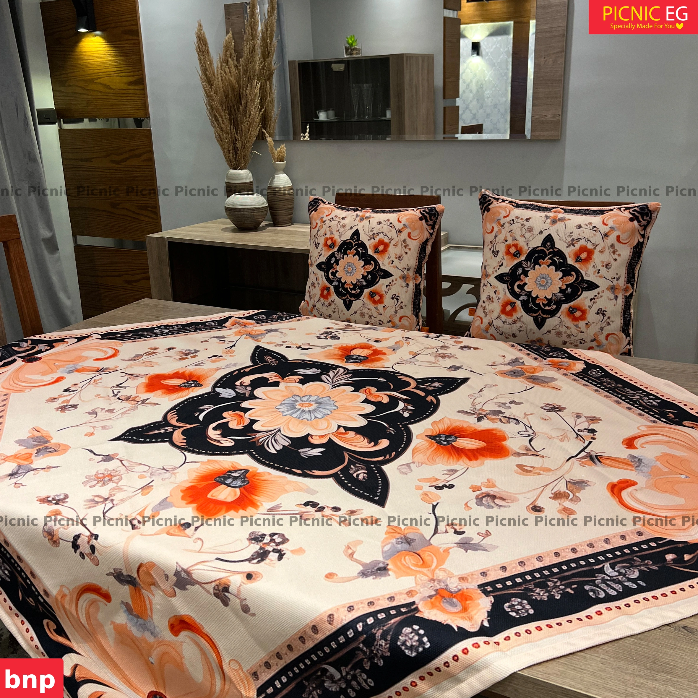 طقم أنيق من قماش قطني تقيل بجودة عالية، متوفر بمقاسات متنوعة تناسب جميع أنواع الترابيزات. مزوّد برانر بنفس التصميم ليضفي لمسة فخامة على السفرة. تصميمه البسيط والشيك يناسب كل الأذواق ويتماشى مع أي ديكور. اختيار مثالي للاستخدام اليومي أو المناسبات.