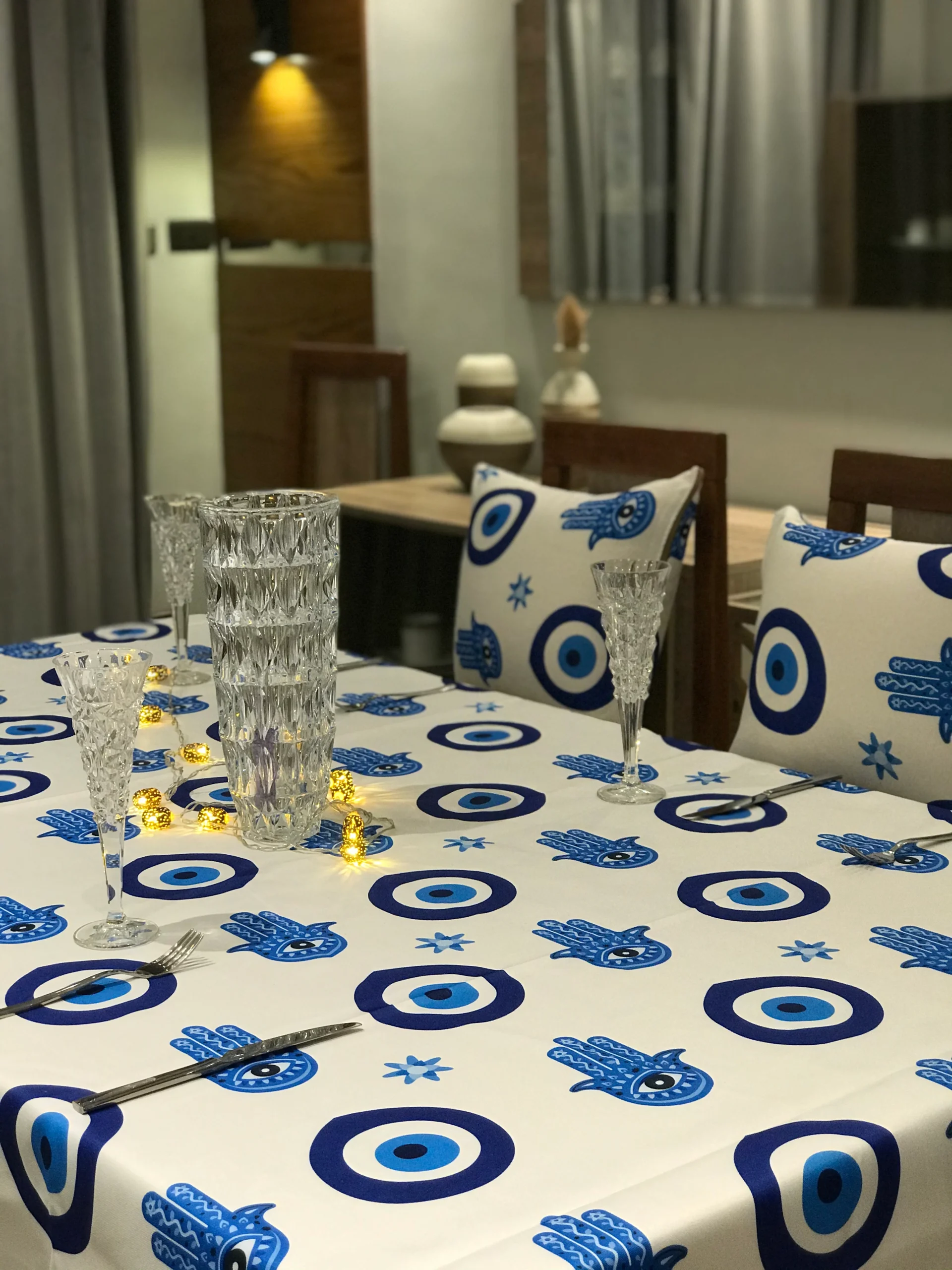 طقم أنيق من قماش قطني تقيل بجودة عالية، متوفر بمقاسات متنوعة تناسب جميع أنواع الترابيزات. مزوّد برانر بنفس التصميم ليضفي لمسة فخامة على السفرة. تصميمه البسيط والشيك يناسب كل الأذواق ويتماشى مع أي ديكور. اختيار مثالي للاستخدام اليومي أو المناسبات.