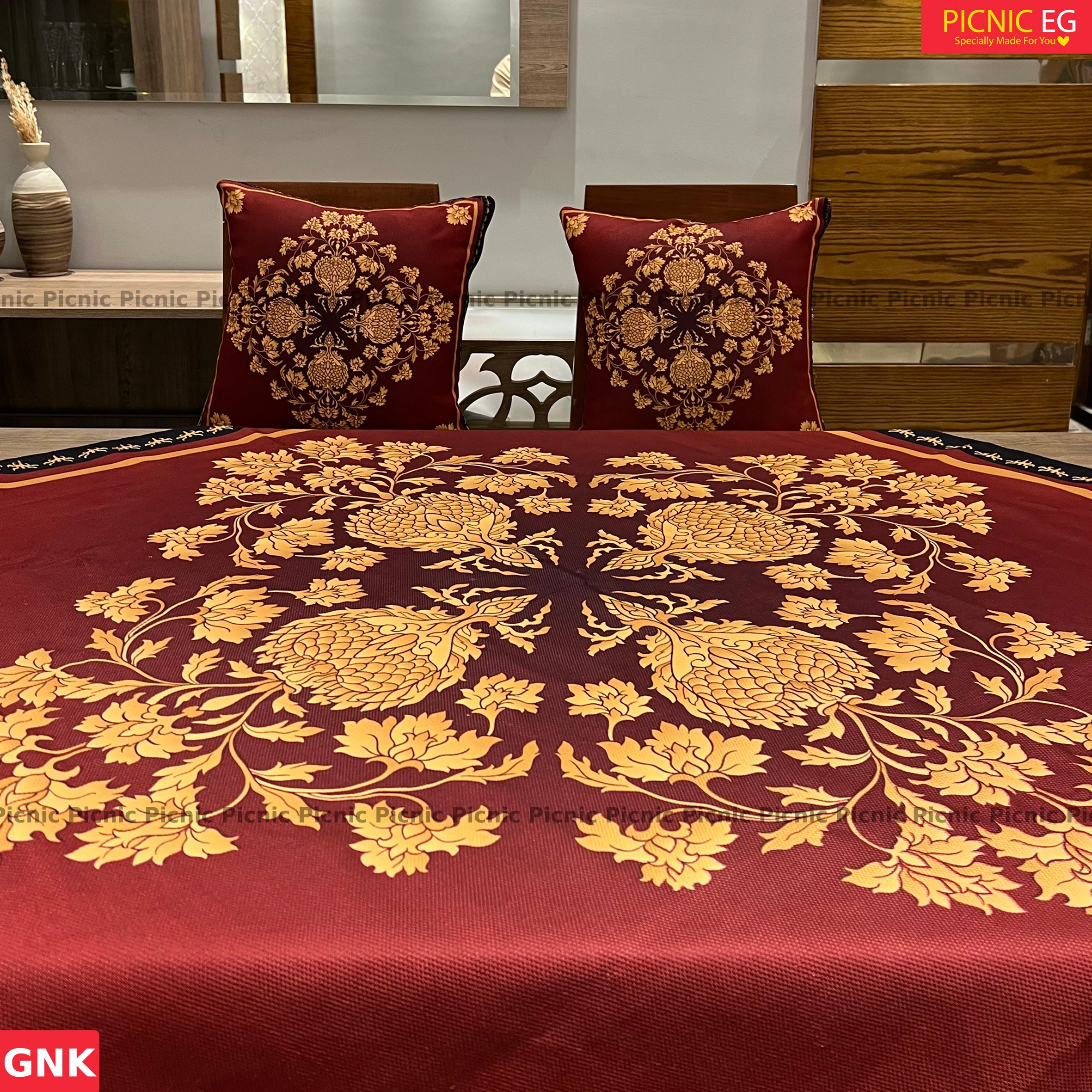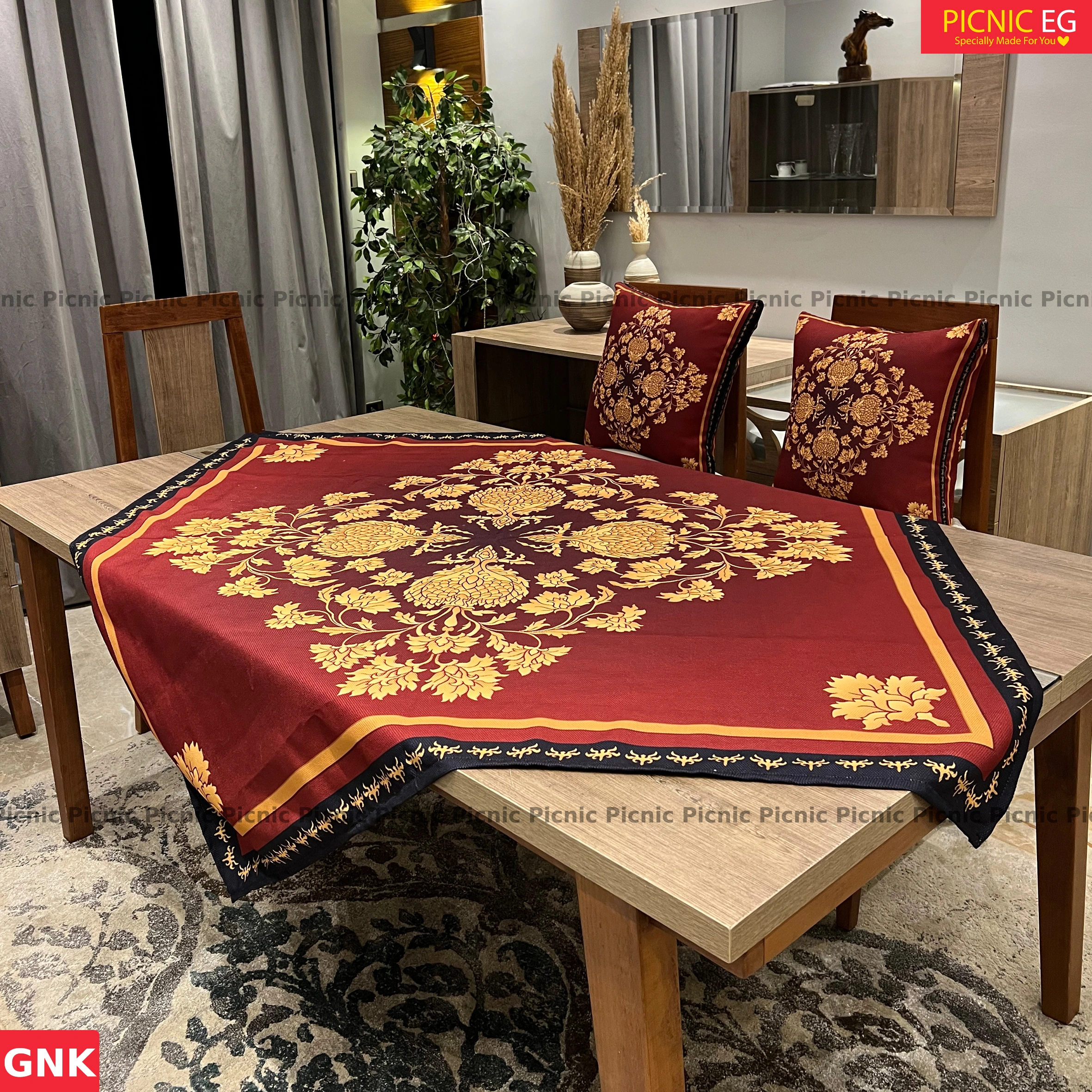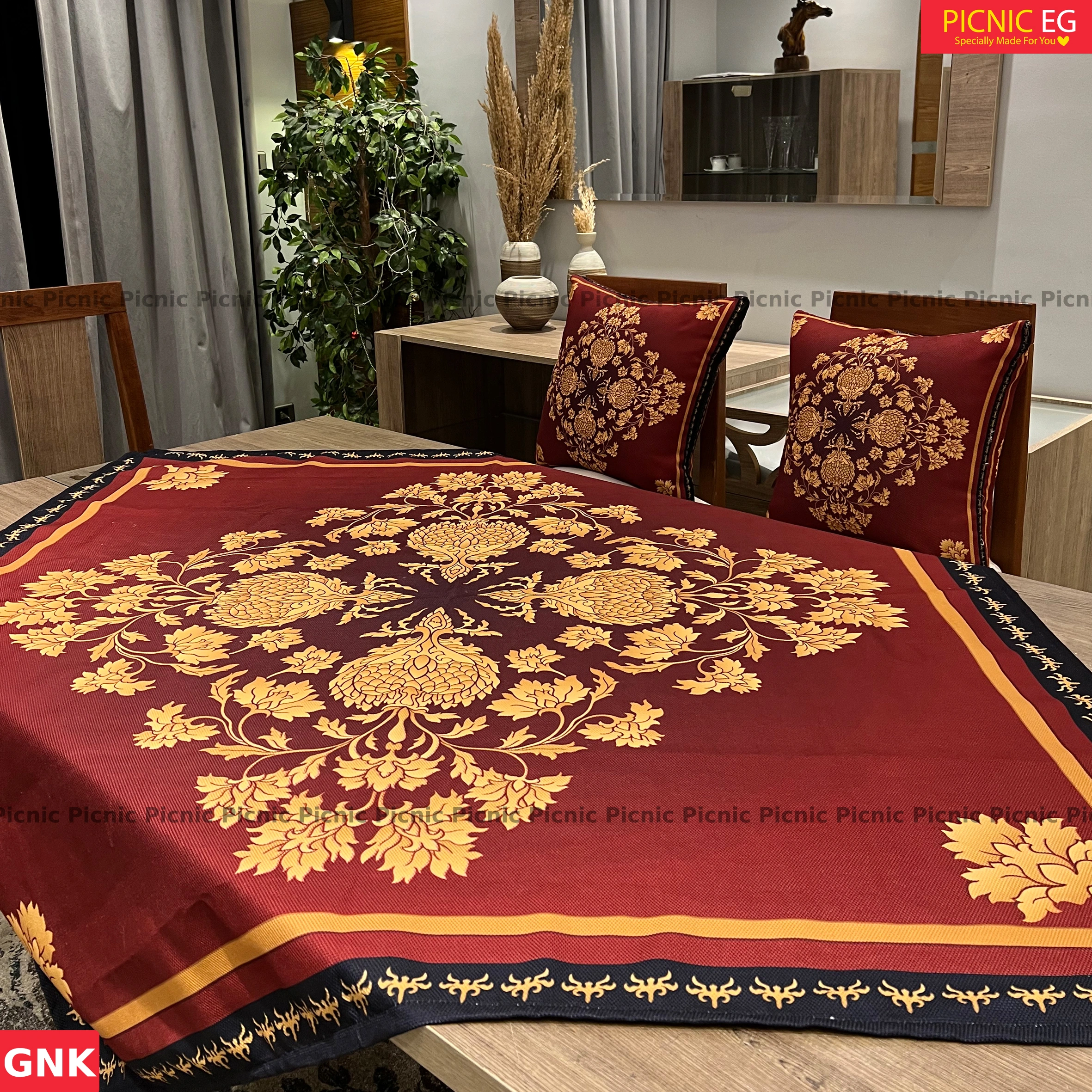 طقم أنيق من قماش قطني تقيل بجودة عالية، متوفر بمقاسات متنوعة تناسب جميع أنواع الترابيزات. مزوّد برانر بنفس التصميم ليضفي لمسة فخامة على السفرة. تصميمه البسيط والشيك يناسب كل الأذواق ويتماشى مع أي ديكور. اختيار مثالي للاستخدام اليومي أو المناسبات.