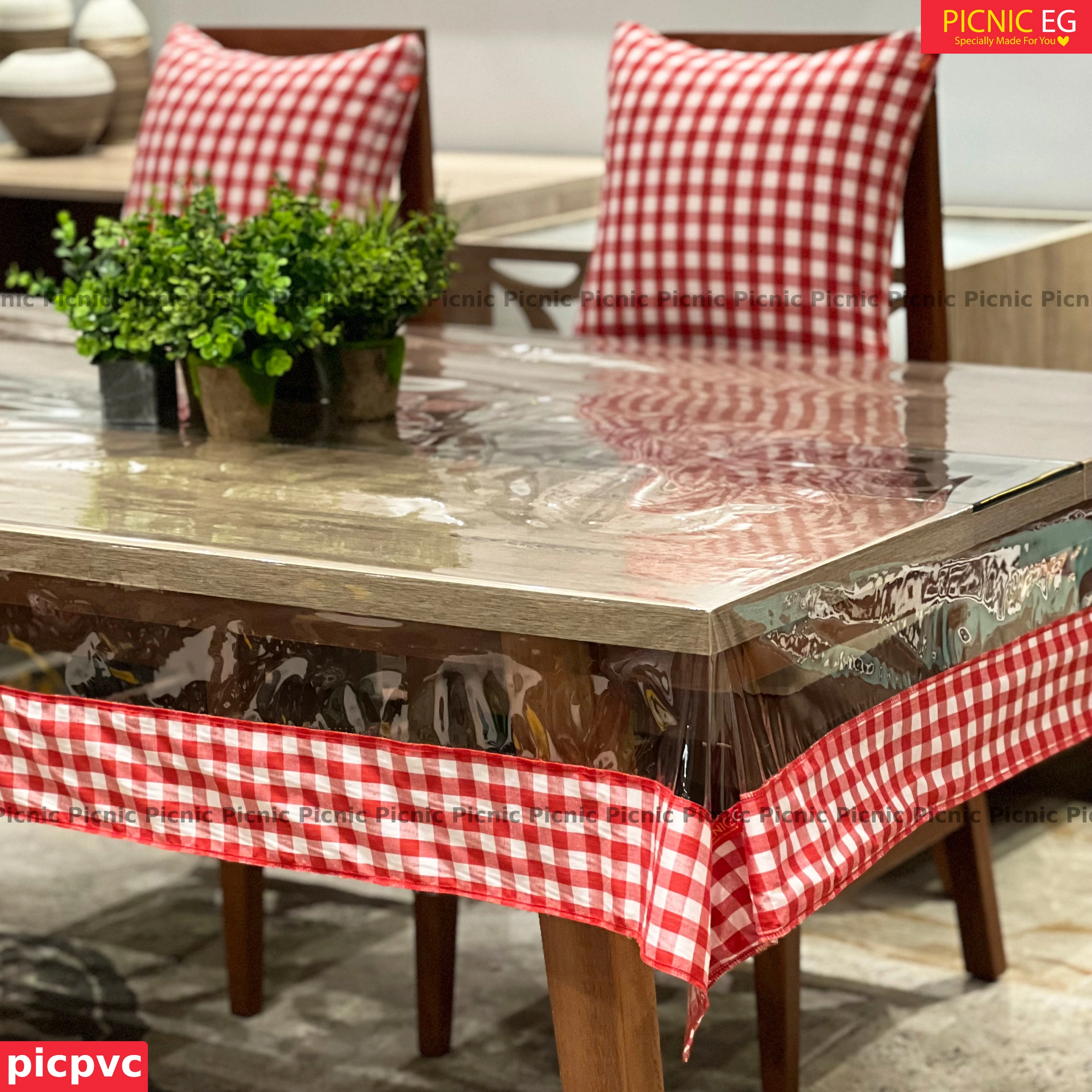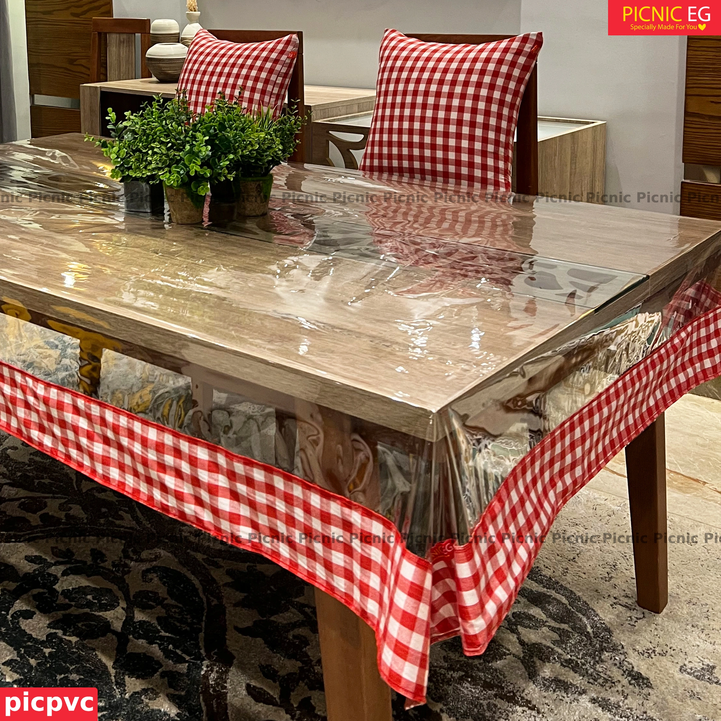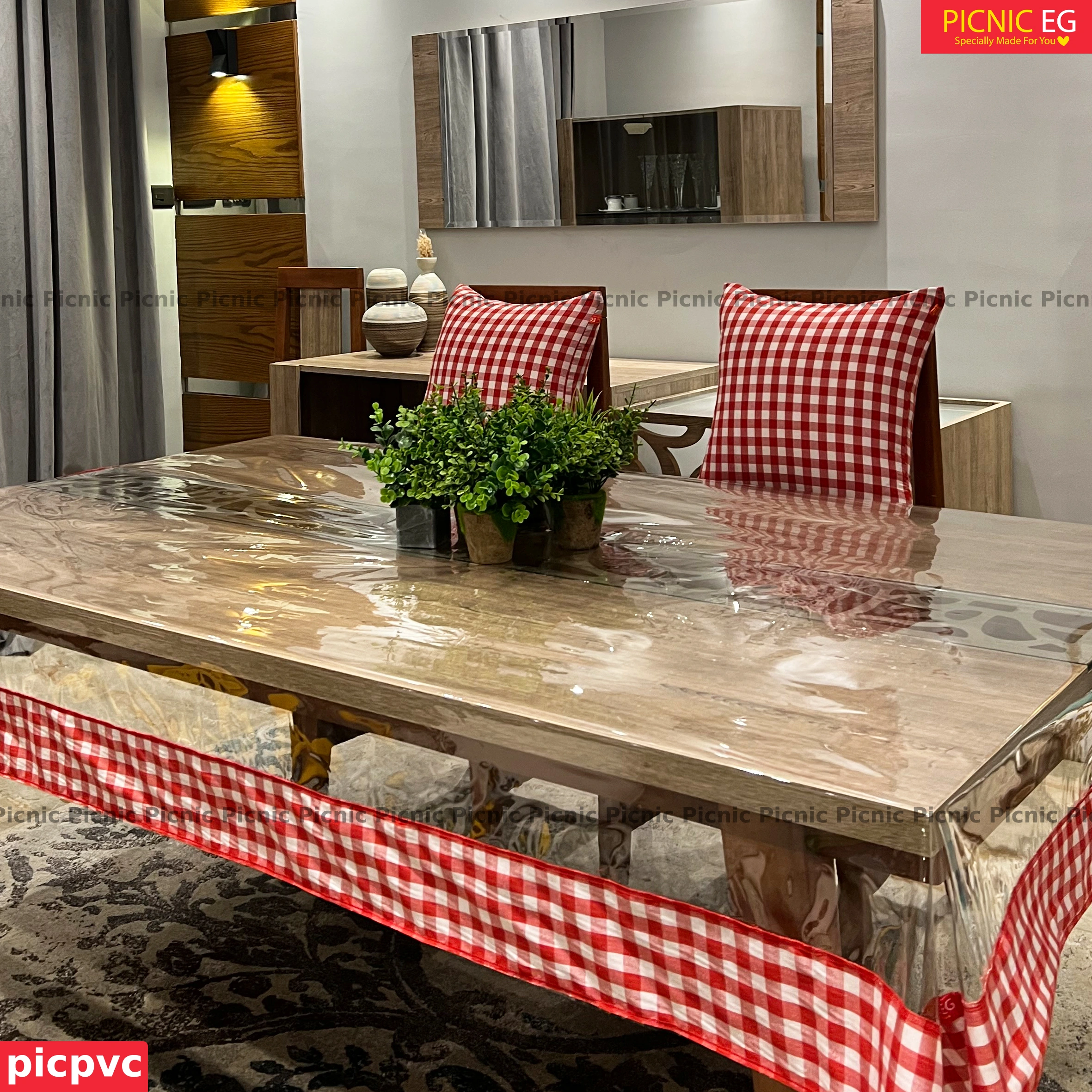مفرش PVC شفاف مزين بكاروهات من الأطراف، عملي وأنيق وسهل التنظيف.