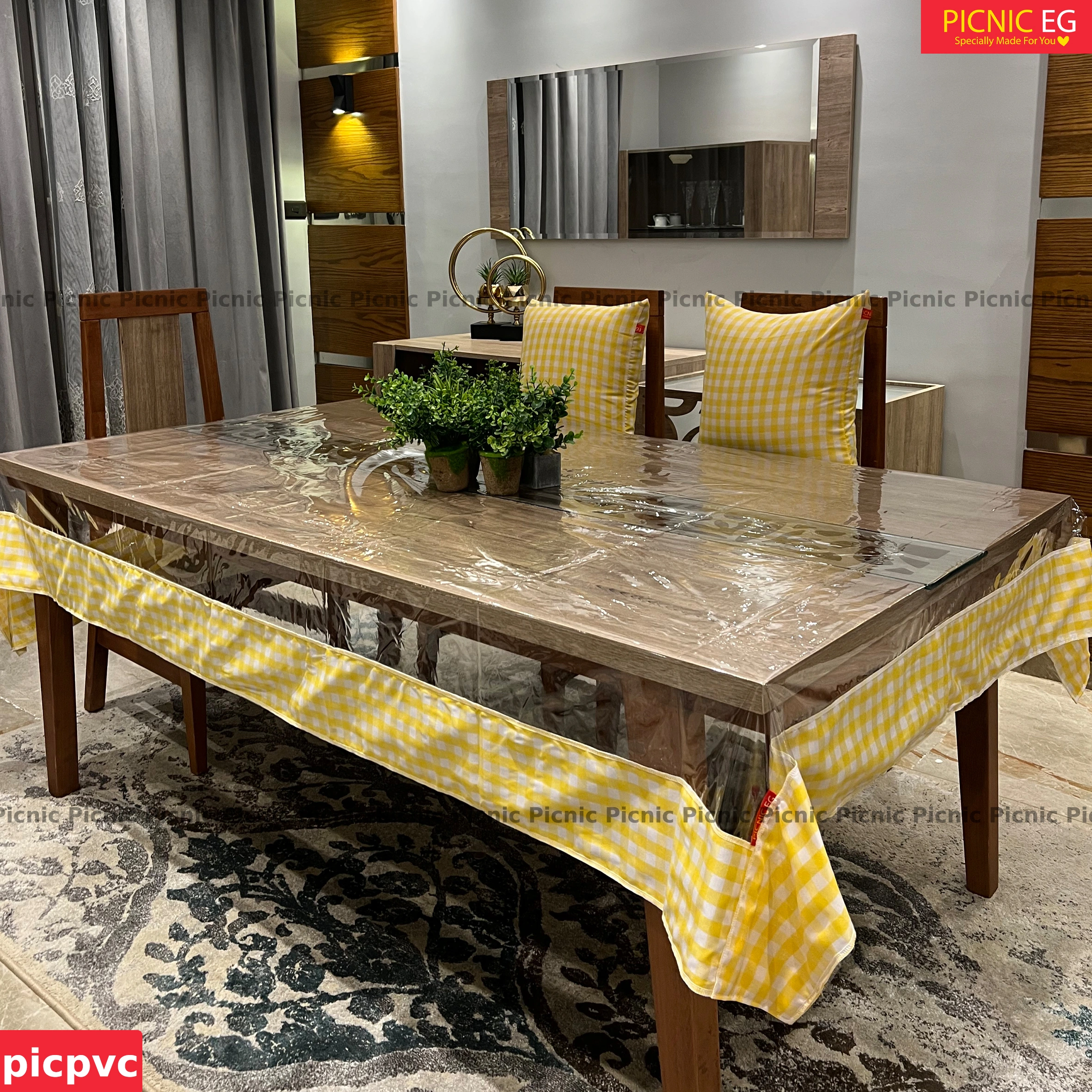 مفرش PVC شفاف مزين بكاروهات من الأطراف، عملي وأنيق وسهل التنظيف.